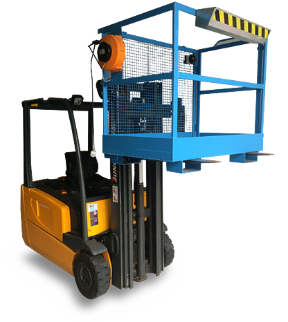 Werkplatform met gereedschaphouder waarbij gebruik word gemaakt van een heftruck of shovel om veilig op hoogte te werken.